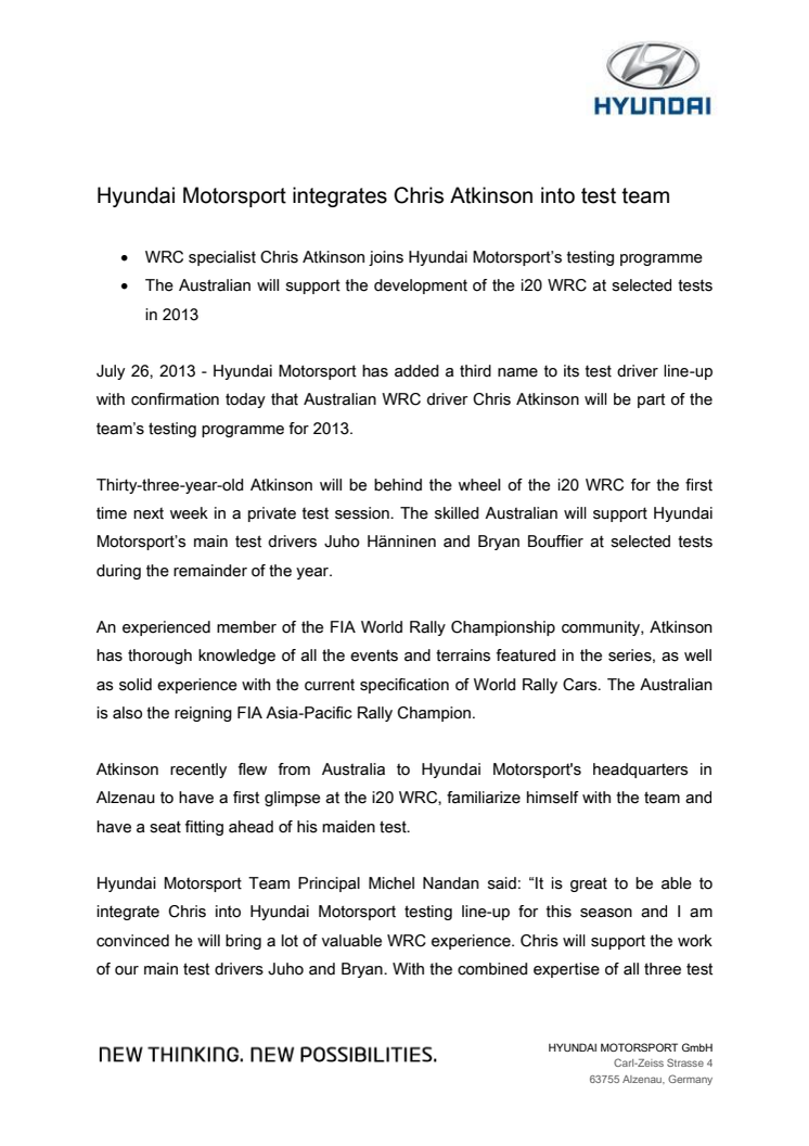Den australske WRC-spesialisten Chris Atkinson er den tredje testføreren i Hyundais Motorsports testprogram for 2013.