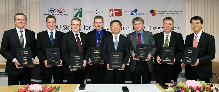 Bilde venstre: Lars Vargö (Ambassadør for Sverige), Bjørn Simonsen (HyNor), Björn Arnasson (Vätgas Sverige), Mikael Sloth (Scandinavian Hydrogen Highway Partnership), Dr. Woong-Chul Yang (Hyundai), Flemming Wennike (Hydrogen Link), Jón Björn Skúlasson (Icelandic New Energy Ltd.), Nam Hoon Kang (Koreanske energidepartementet). Se også http://www.zero.no/