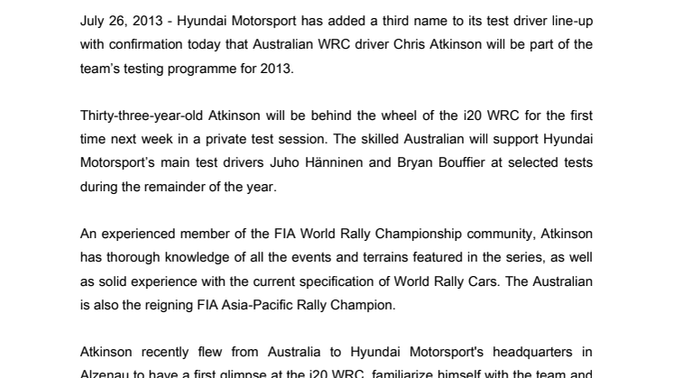Den australske WRC-spesialisten Chris Atkinson er den tredje testføreren i Hyundais Motorsports testprogram for 2013.