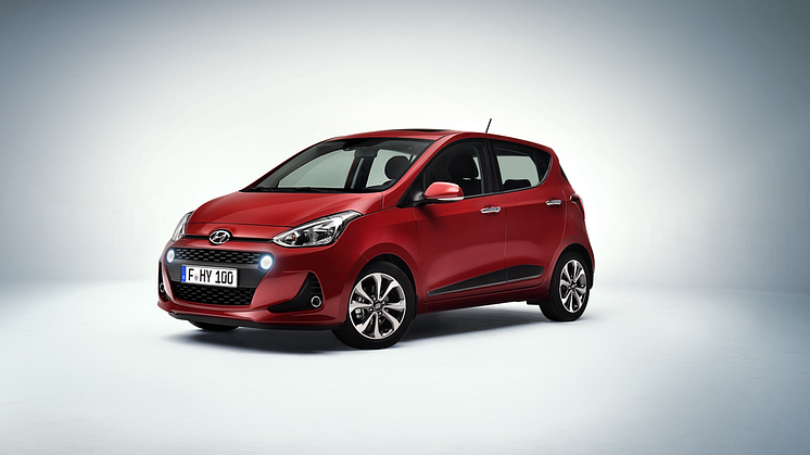 Hyundai i10 er en stor, liten bil med god plass og moderne utseende. Nå har den fått Hyundais nye «cascade»-grill, på lik linje med nye i30, som også får sin debut på bilmessen i Paris i høst. Denne grillen vil bli Hyundais kjennemerke i tiden fremover, på i10 også nå kombinert med nye runde LED dagslys. Også baksiden av bilen har fått en oppgradering med nye støtfangere og runde tåkelys som speiler fronten. Det blir også flere interiørfarger å velge mellom; rød, blå, oransj, beige, og svart. Oppgraderte i10 får nye 14-toms felger.