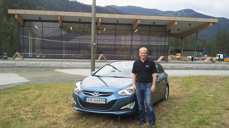 Billedtekst: Stein Vikan med en ny Hyundai i40 foran nye lokaler på Rødberg